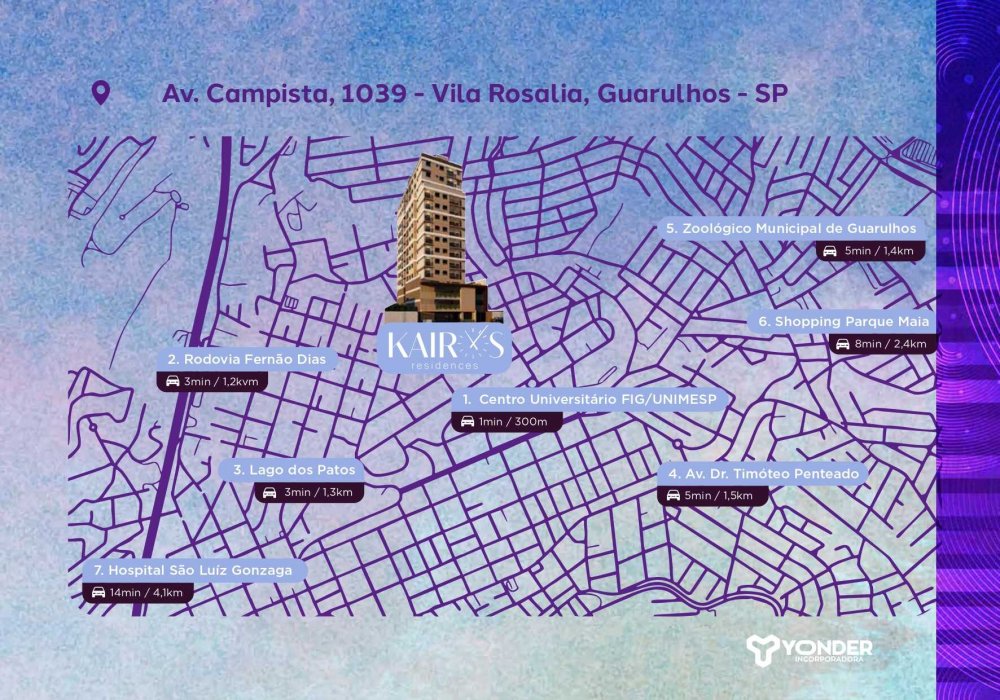 O Kairós Residences está localizado em uma das regiões mais desejadas da cidade de GUARULHOS - Vila Rosália e muito próximo as melhores opções culturais, de lazer e gastronômicas ao seu redor.