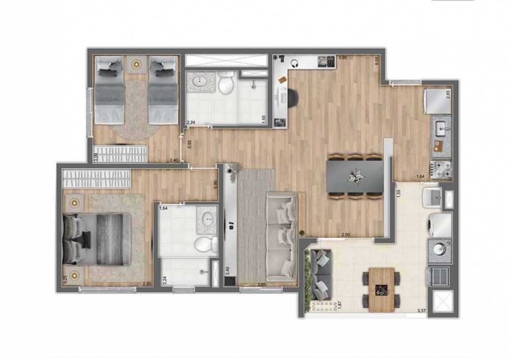 - Tipologia 3 Quartos c/ 1 suíte e terraço com opção de sala ampliada (70m²) - 80 unidades