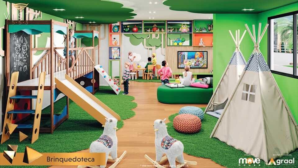 Torre única com lazer multipavimentos, ou seja, espaços para diversão e convivência espalhados em diferentes níveis da torre.