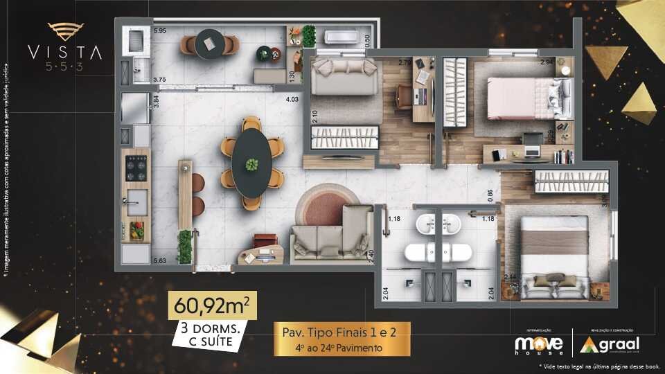 Apartamentos de 2 e 3 dormitórios com varanda, opção com e sem vaga de veículo.