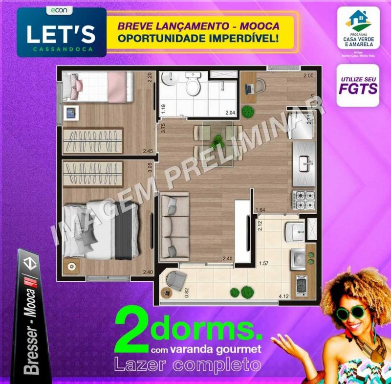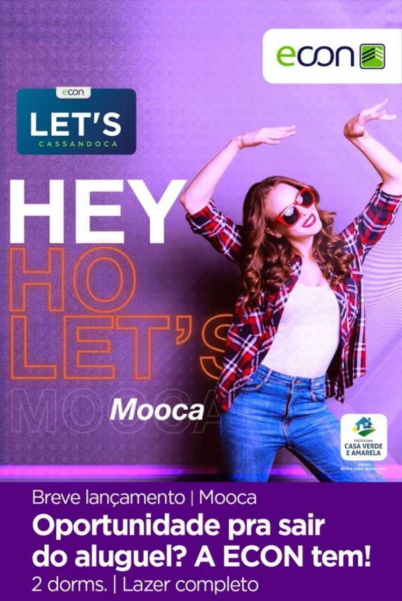 A Econ Construtora está trazendo para a Mooca uma grande novidade que vai mudar a sua vida: o Let's Cassandoca, primeiro empreendimento da Econ Construtora na região. Apartamentos de 2 dormitórios com varanda gourmet e lazer completo com piscinas adulto e infantil, coworking, playground, duas churrasqueiras e muito mais, perto do metrô Bresser-Mooca. Ficha técnica