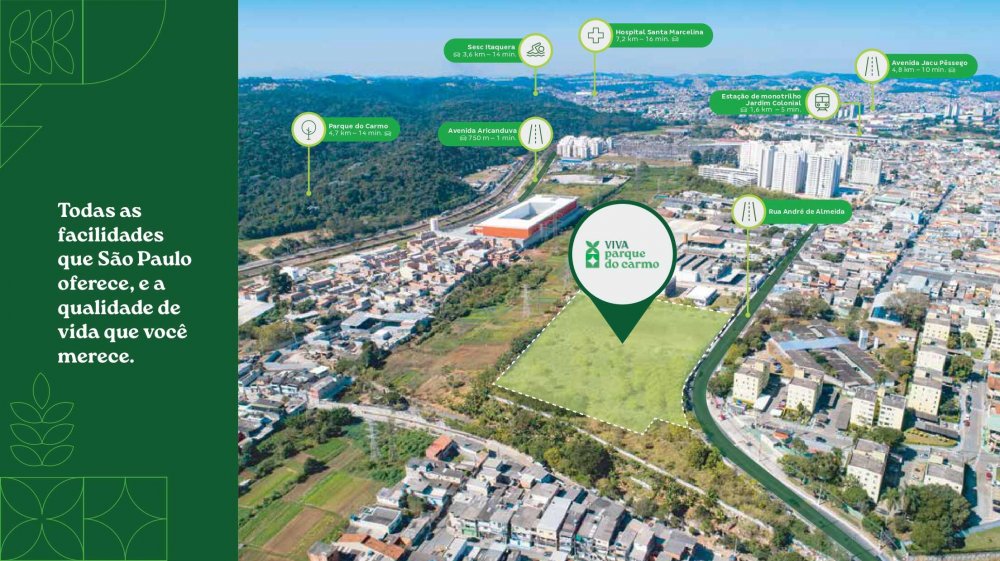 Próximo a Estação Jardim Colonial, Parque do Carmo, Bosque das Cerejeiras, SESC Itaquera, Prefeitura Regional de São Mateus, Vias de acesso: Av. Aricanduva, Av. Ragueb Chohfi, Av. Mateo Bei, Av. Jacu Pêssego