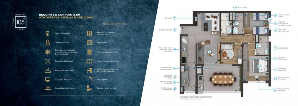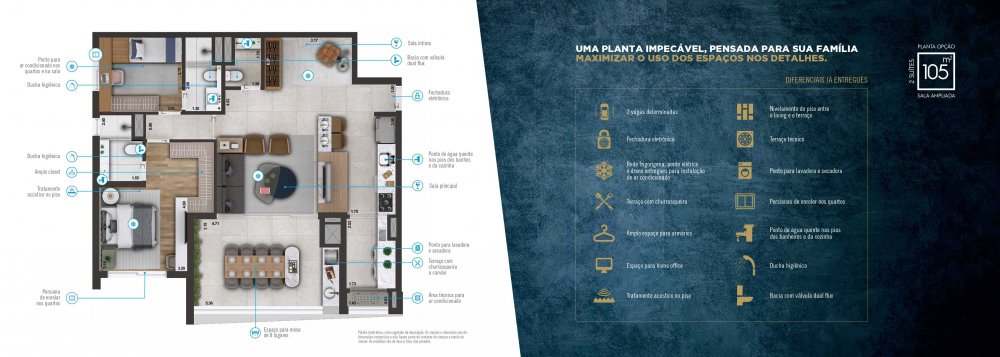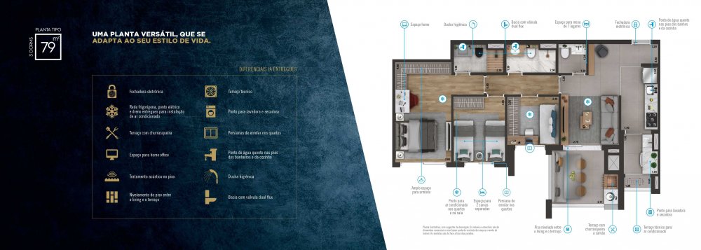 - Apartamentos de 79 e 105m² em um complexo residencial moderno com lazer no rooftop e minimall no térreo.