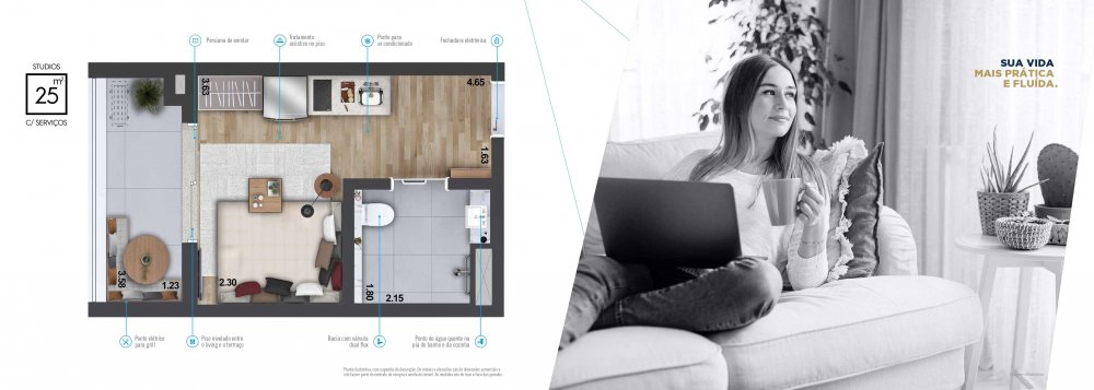 - Studios modernos e inteligentes, de 19 e 25m², com lazer no rooftop e serviços pensados para oferecer praticidade e liberdade.