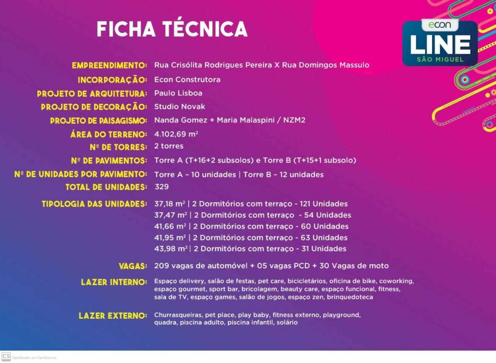 O Line São Miguel conta com apartamentos de 2 dormitórios, Opções de 37m² a 44m² / todos com terraço e opção de vaga na garagem. O lazer é de clube, com mais de 30 itens para diversão e entretenimento.