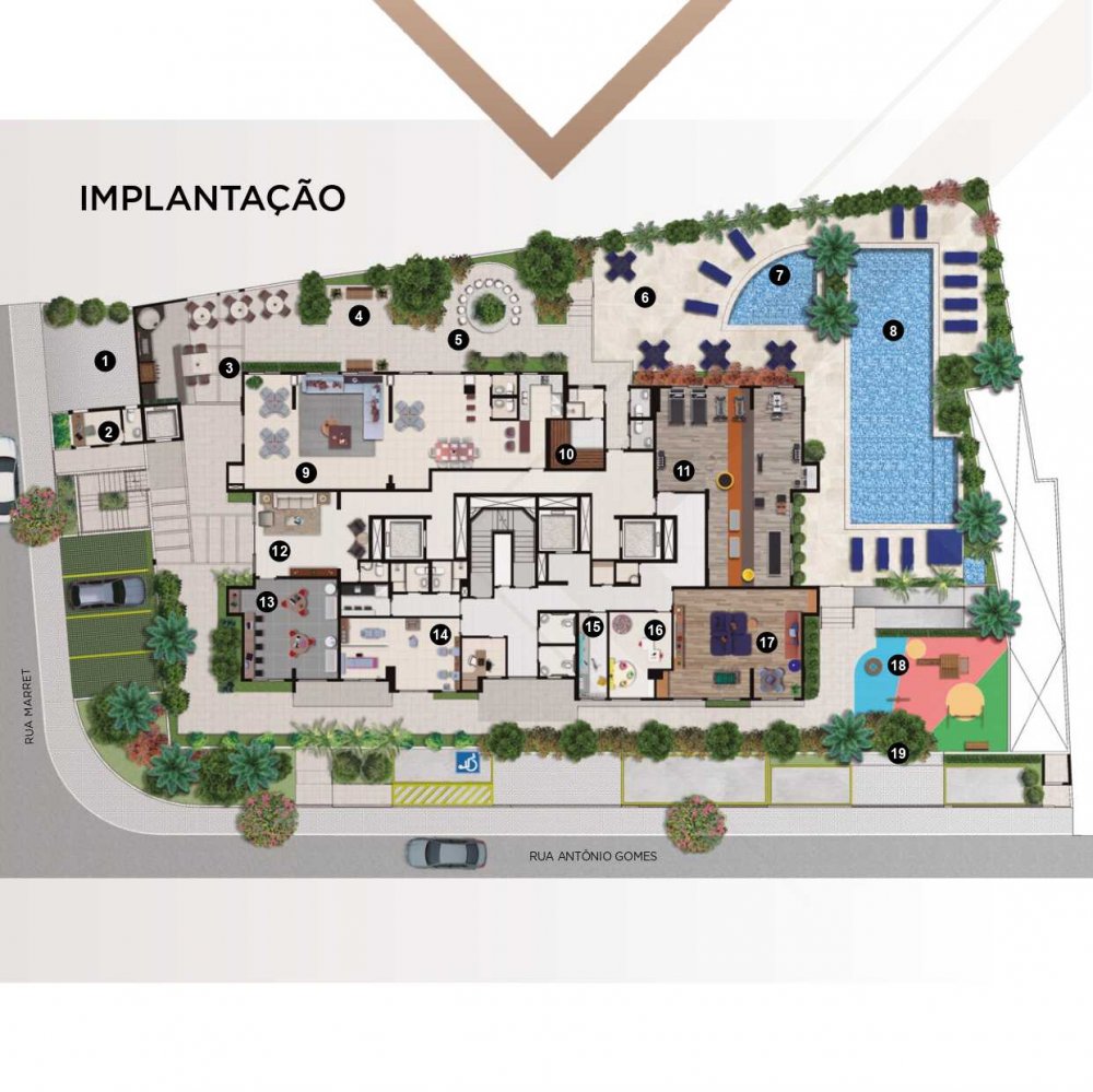 - Área de convívio com praça e pergolado.