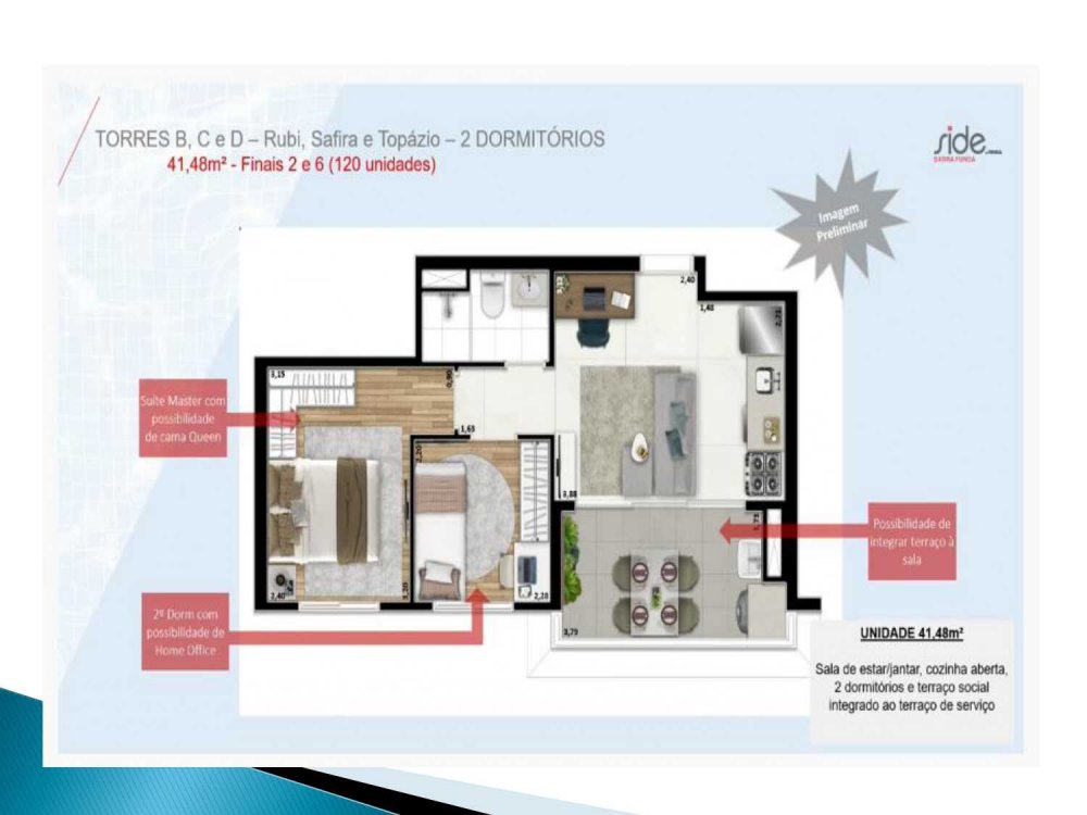 - 41,48 m²: 2 dorms. e terraço integrado.