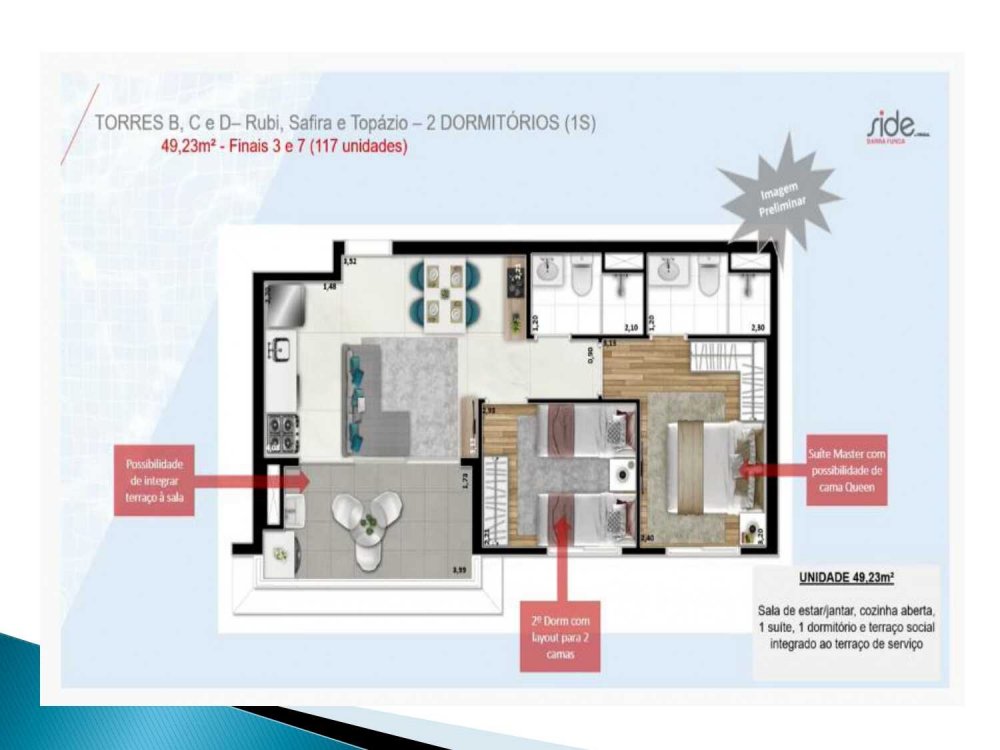 - 49,23 m²: 2 dorms. (suíte) e terraço integrado;