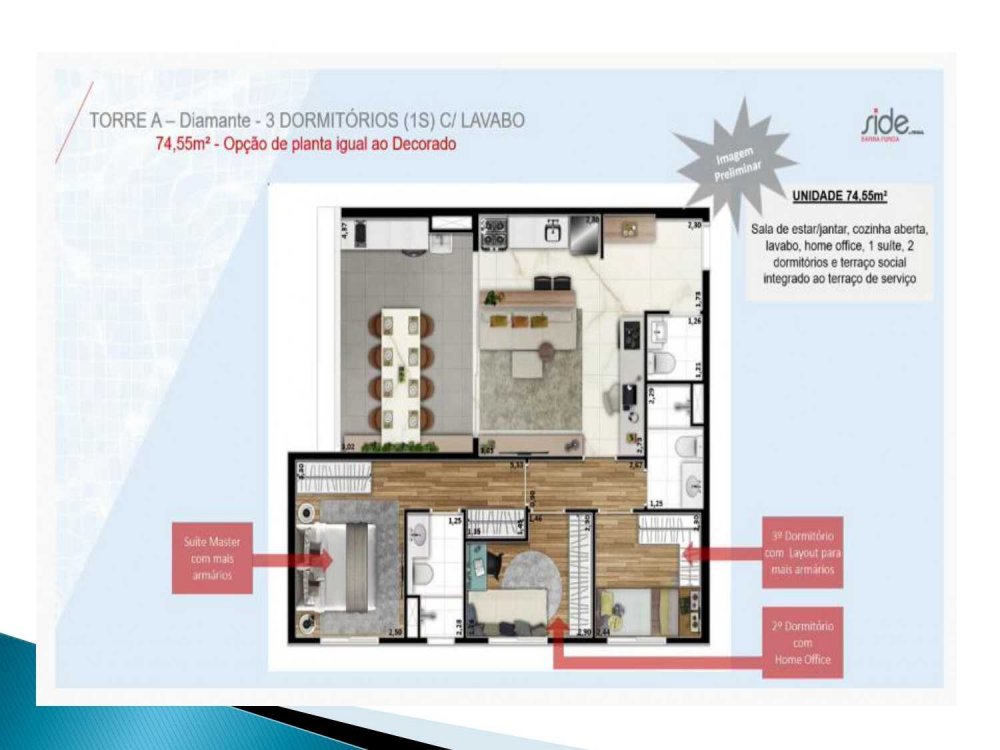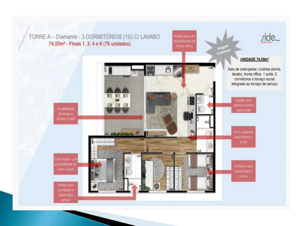 - 74,55 m²: 3 dorms. (suíte), terraço integrado e lavabo;