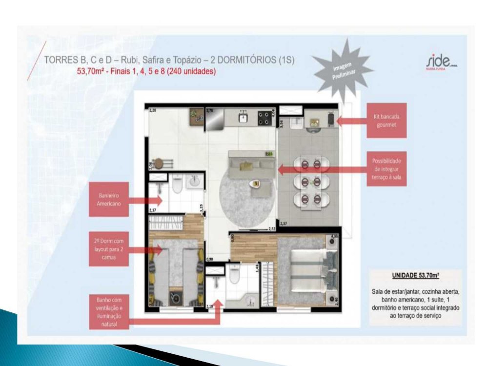 - 53,70 m²: 2 dorms. (suíte) e terraço integrado;