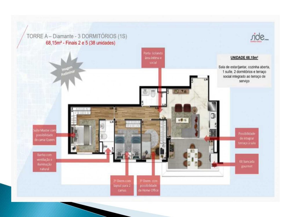 - 68,15 m²: 3 dorms. (suíte) e terraço integrado;
