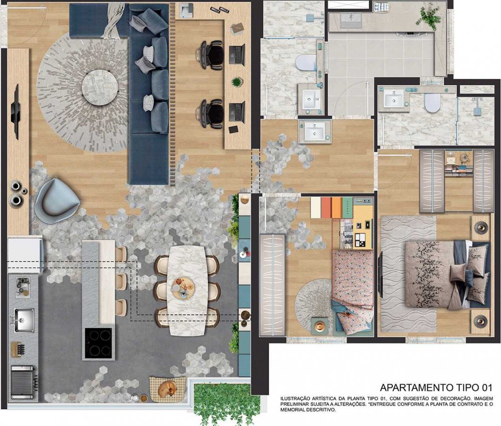 - Opções de 67,72m², 76,66m² e 83,68m²