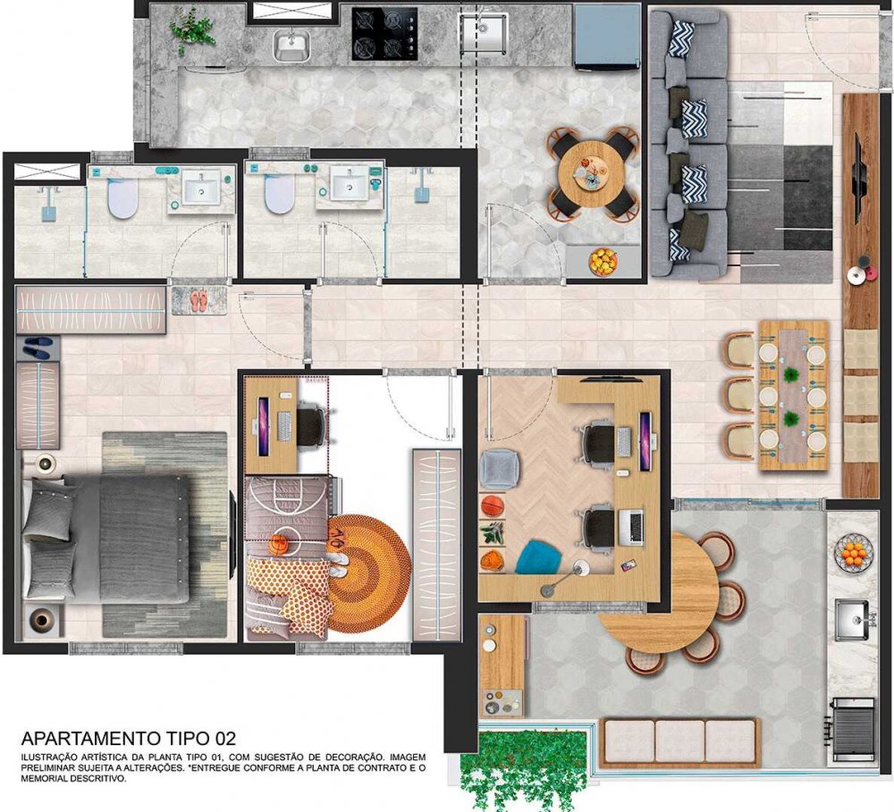 - Apartamentos de 3 e 2 dormitórios com suíte, terraço com jardim e depósito privativo.