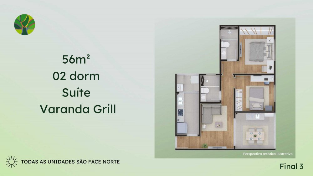 - 56 m² 2 dormitórios, Suite, Varanda Grill e Vaga