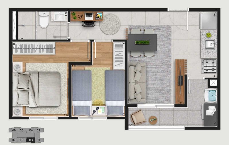 - Plantas tipo 1 = 42m (meio) e tipo 2 = 44m (Ponta) - Contendo: 2 Dormitórios, Sala, Cozinha, Lavanderia, Banheiro e Varanda