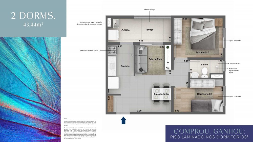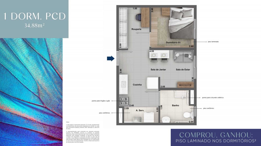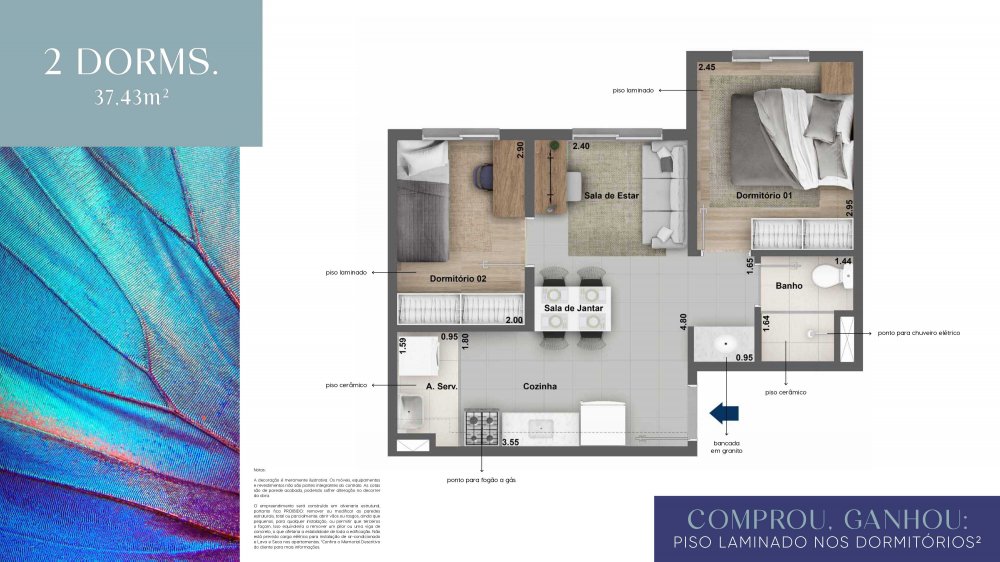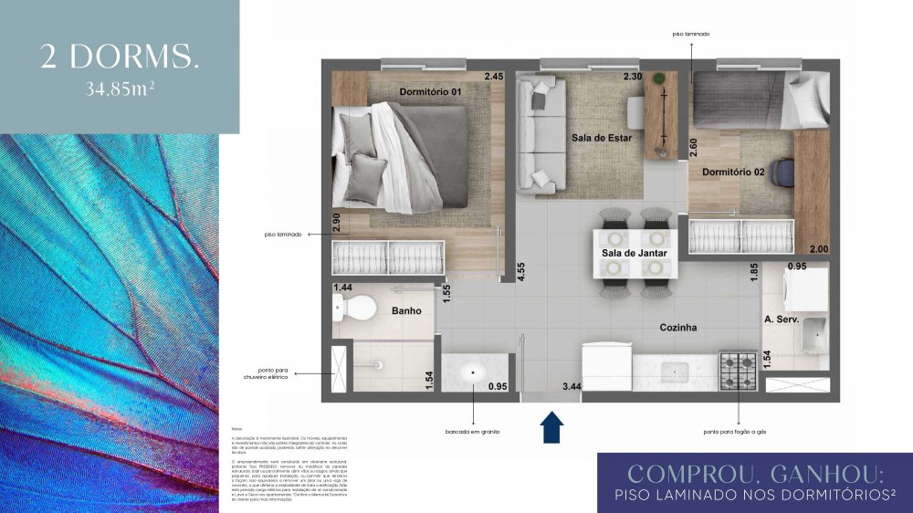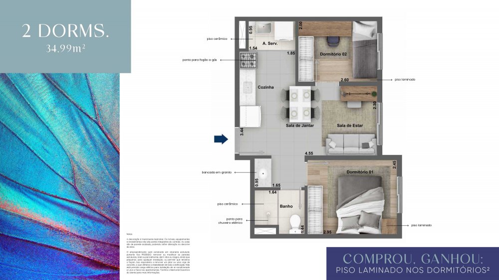 O Projeto está dentro do Programa Casa Verde e Amarela e tem os juros mais baixo do mercado. Além disso, por ser o seu primeiro imóvel, a Escritura é totalmente grátis e ainda tem de brinde o piso laminado nos quartos.