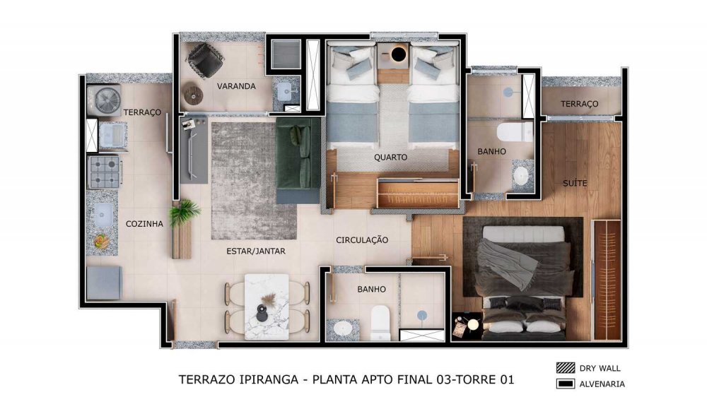 2 Dormitórios com Suíte Área total: 51,29 ou 51,71 ou 53,03m²*