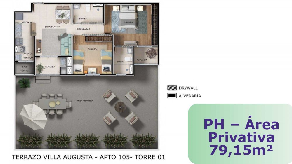 2 Torres 336 unidades 326 vaga individual 30 vagas presas ( pois alguns apartamentos terão 2 vagas de vaga). *9 unidades com quintal até 79m²