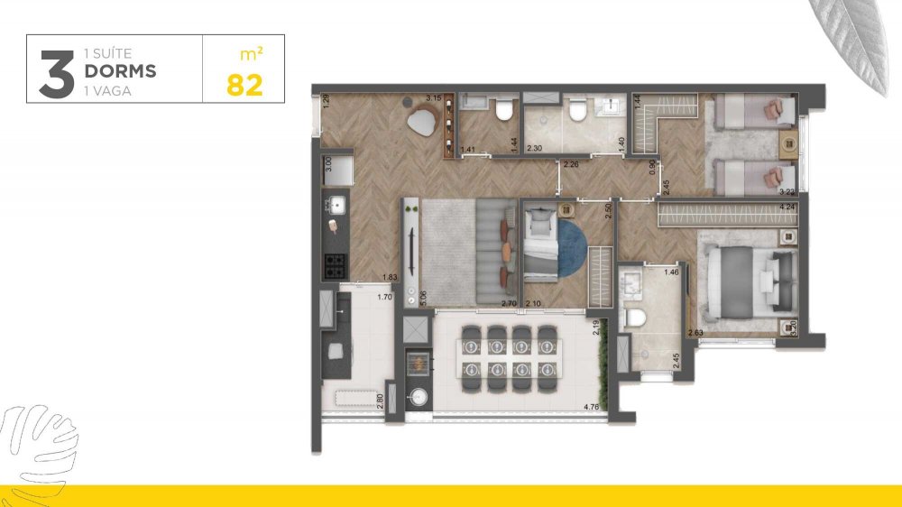 82m² - 3 dorms (1 suíte) - 1 vaga
