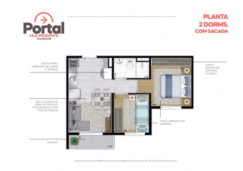 - Apto tipo 2 Dorms. c/ Terraço Coberto: 34,73m² a 35,27m²