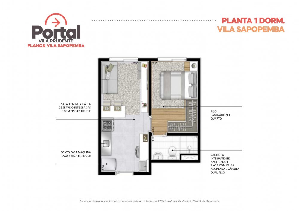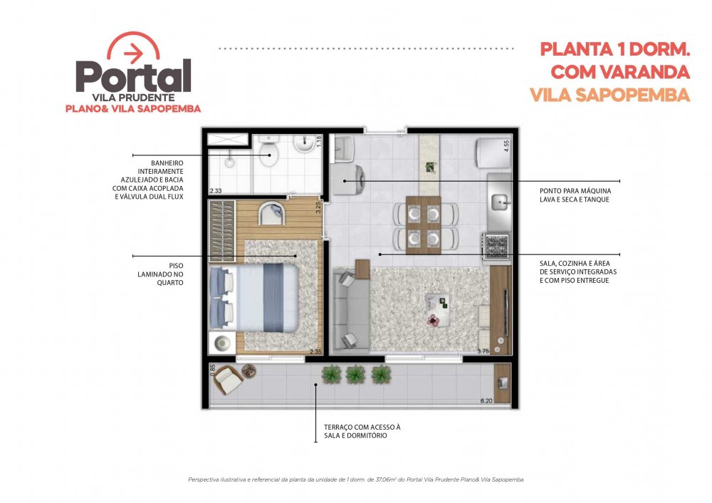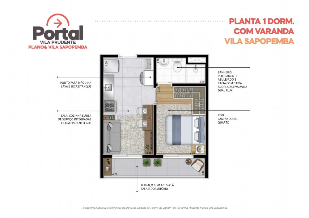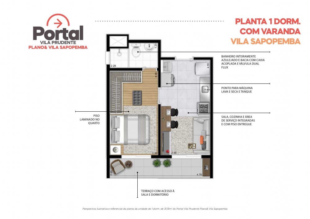 - Apto tipo 2 Dorms. c/ Terraço Coberto: 34,73m² a 35,27m²