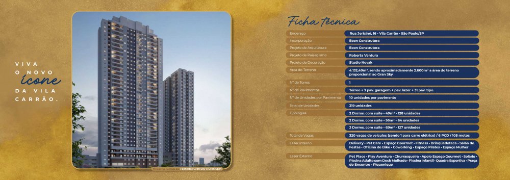 Gran Sky Econ Vila Carrão é um empreendimento residencial localizado na Zona Leste de São Paulo, que combina modernidade, conforto e uma localização estratégica. Situado na Rua Jericino.