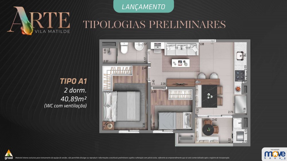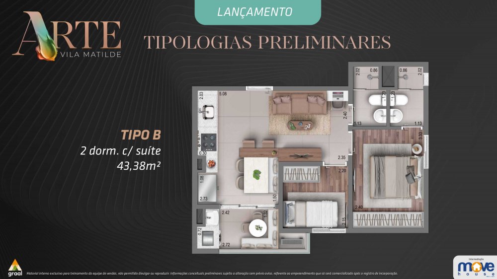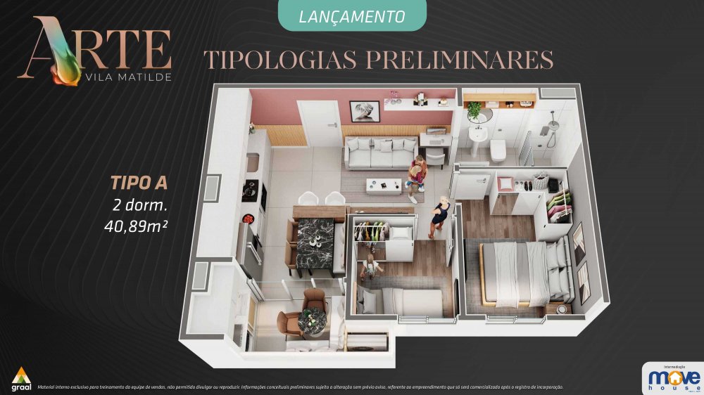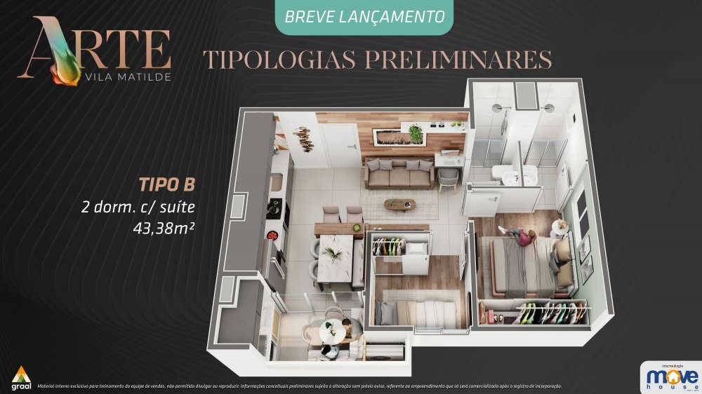 Apartamentos tipo de 40,89m² (2 quartos) e 43,38m² (2 quartos, sendo 1 suíte) à venda na planta, a apenas 5 minutos do Metrô Vila Matilde!
