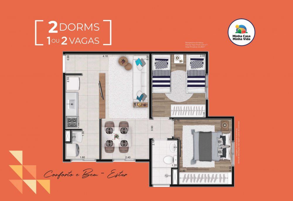 Apartamentos de 2 Dormitórios com 1 vaga de garagem.
