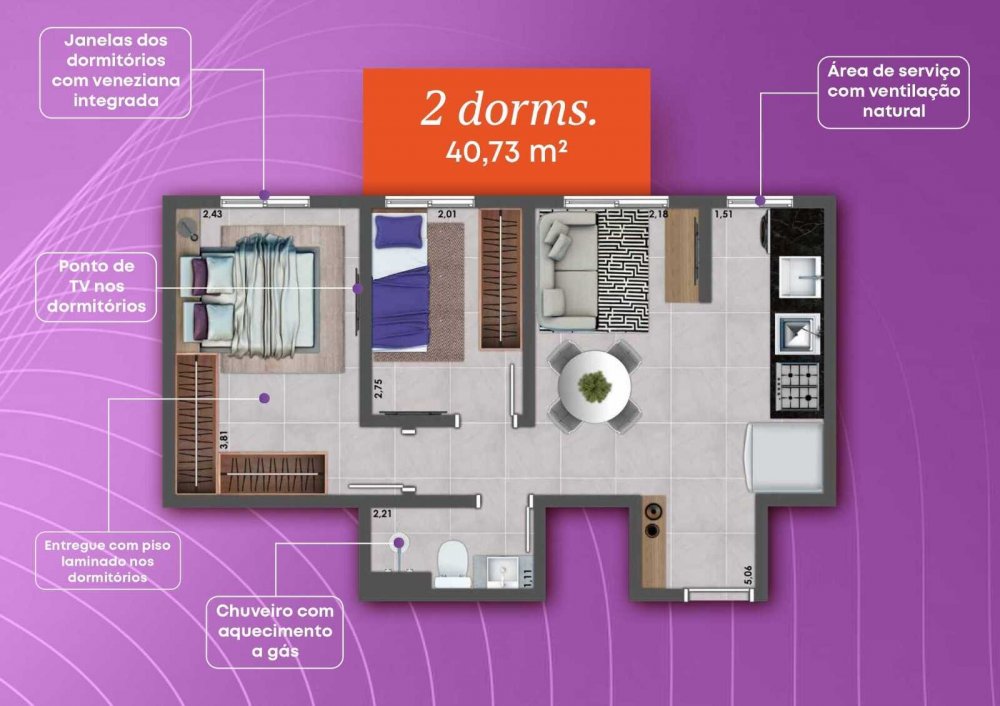 - Tipologia: 36 m2, 38 m2, 40 m2, 41 m2, 44 m2 e 47 m2