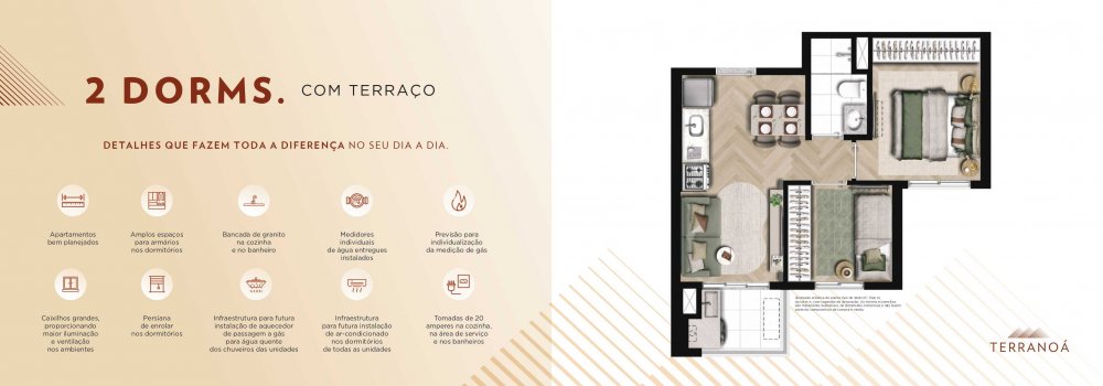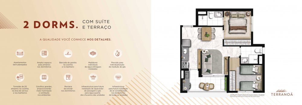 Apartamentos de 2 dormitórios com plantas bem distribuídas: