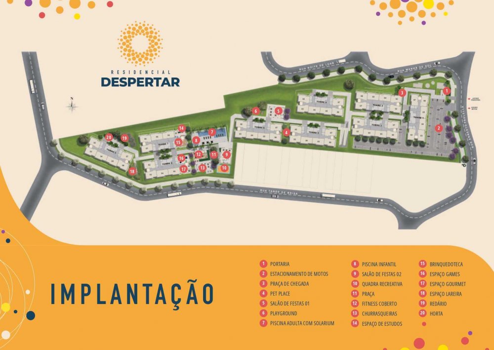 Praça de chegada, Pet Place, Salão de Festas, Playground, Piscina Adulta com Solarium, Piscina Infantil, Quadra Recreativa, Praça Fitness, Churrasqueira, Espaço de Estudos, Brinquedoteca, Espaço Games, Espaço Gourmet, Espaço Lareira, Redário, Horta e Lounge Lareira.