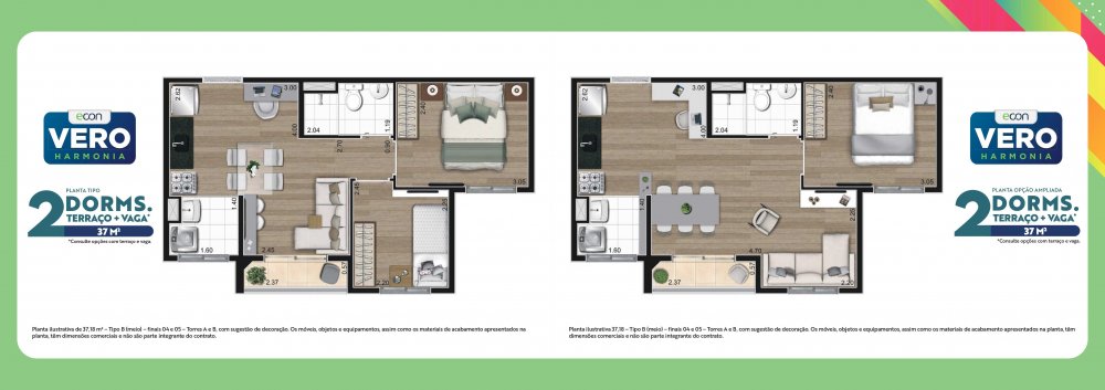 - 2 Quartos c/ terraço (37m²)- Opção Sala Ampliada - 148 unidades