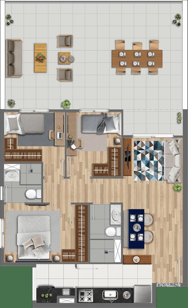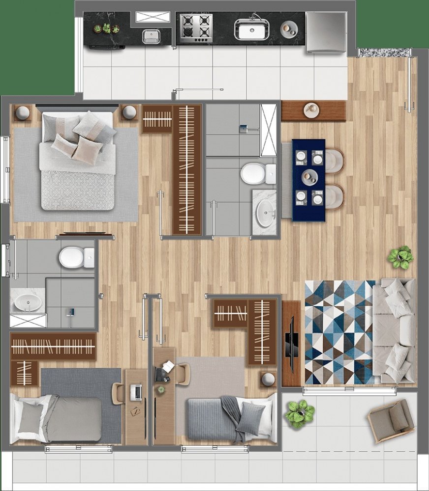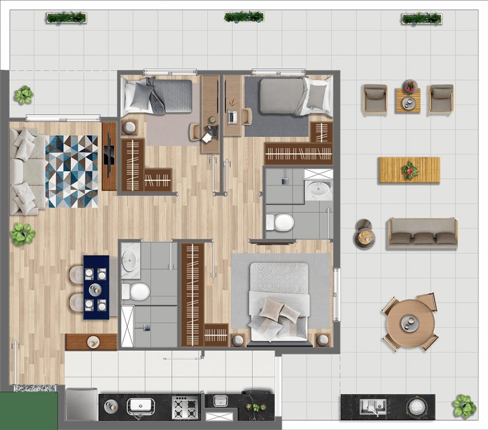 - Metragens Apartamentos: 43, 57, 73, 90, 102, 131M² / 2 e 3 Dormitórios