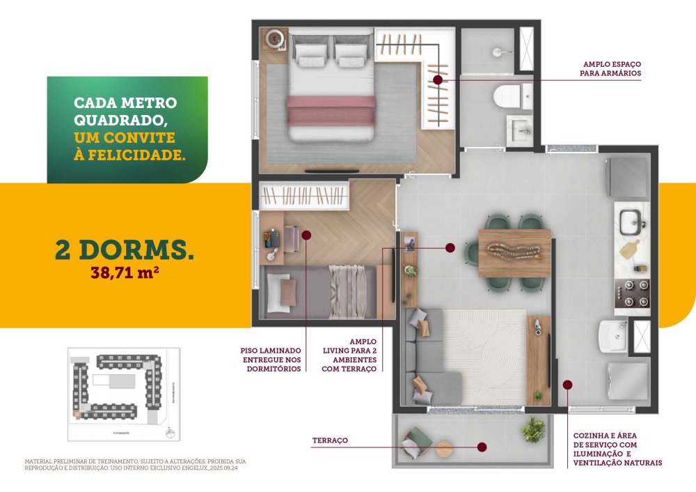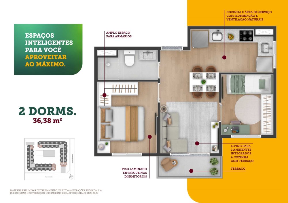 Liber Jaçanã Engelux é um lançamento de 02/2026, composto por 2 torres e 455 residências. As plantas variam entre 26 a 38 m², sendo algumas residências com 1 e 2 quartos.