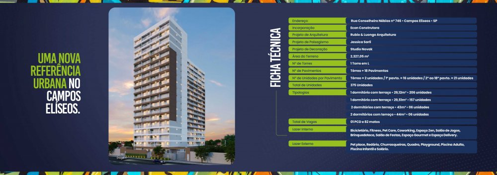 Econ Campos Eliseos - Residencial é um Lançamento Localizado na Rua Conselheiro Nebias, Campos Elíseos, em São Paulo/SP. O empreendimento oferece Studios e apartamentos de 1e 2 dormitório, com área útil de 29m2, 43m2 e 44m2. Opções Com Terraço e Vaga de Moto. Não há vaga de garagem.