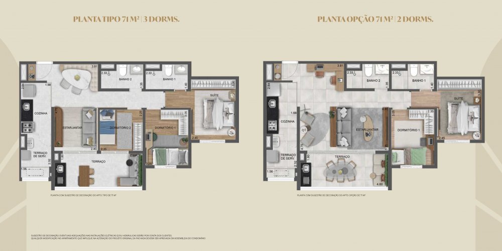 71 m² (3 dorms. - 1 suíte) - 1 vaga: 90 unidades