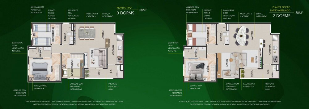 - 58m² 2 ou 3 dormitórios com varanda Gourmet / Suite / Vaga de garagem (1 OU 2 VAGAS)