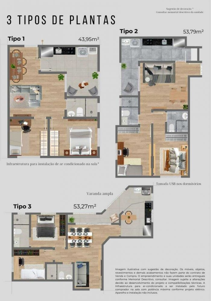 Apartamentos com 2 Dormitórios, Opções (1 Suíte) com varanda plantas de 43m² a 53m² / Com Vaga de garagem e Lazer Completo.