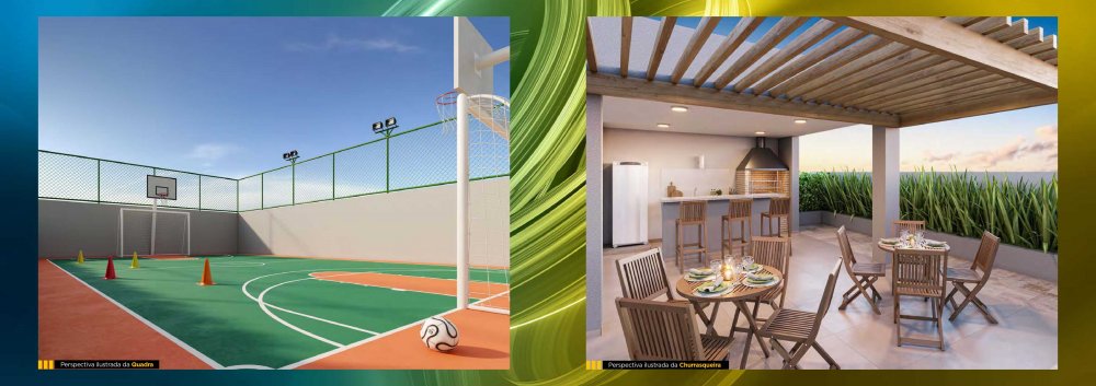 Apartamentos de 2 quartos (44 e 45m²), 2 quartos com suíte (55 e 56m²) e 3 quartos com suíte (66 e 67m²), todos com terraço gourmet com churrasqueira e opção de ampliação da sala.