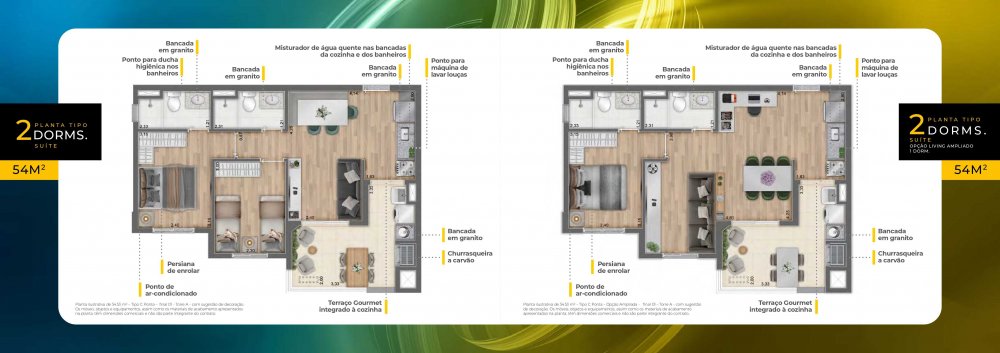 Apartamentos de 2 quartos (44 e 56m²) e 3 quartos com suíte (66 e 67m²), todos com terraço gourmet com churrasqueira e opção de ampliação da sala.