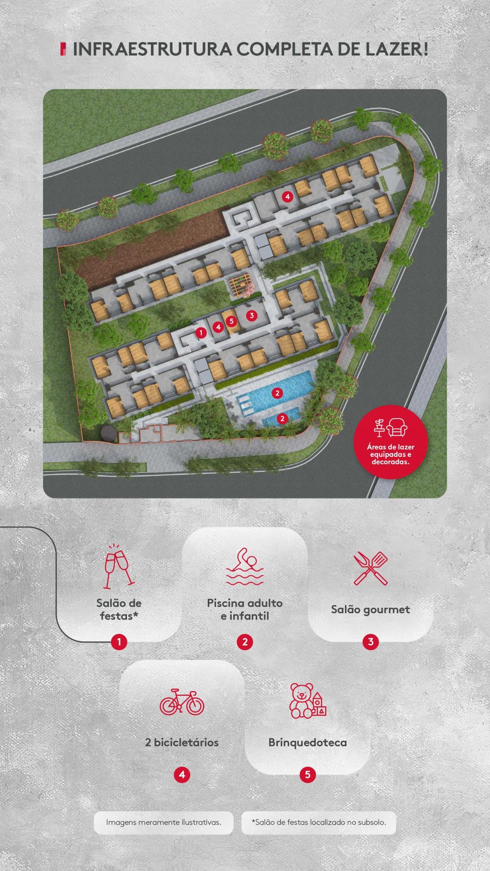 •Salão de Festas •Espaço Gourmet •Brinquedoteca •2 Bicicletários Áreas Externas •Piscina Adulto •Piscina Infantil
